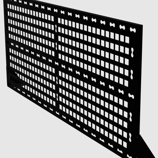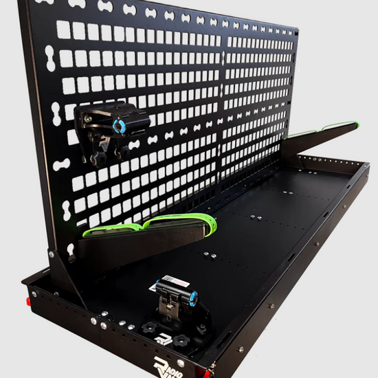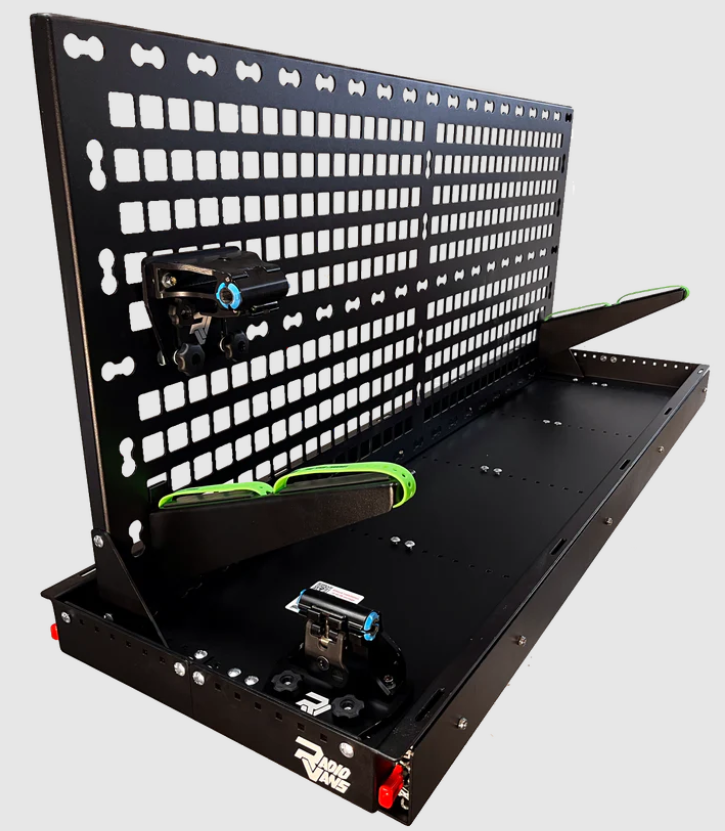 The RADIO VANS Radar Gear Wall is a modular storage panel designed to maximize vertical space inside your adventure van. Built with a combination of integrated L-track and MOLLE patterns, this gear wall creates a highly adaptable storage system for securing tools, recovery gear, bike accessories, and everyday equipment.