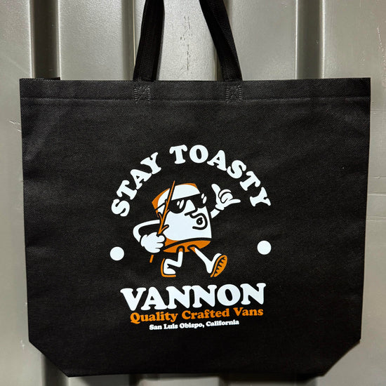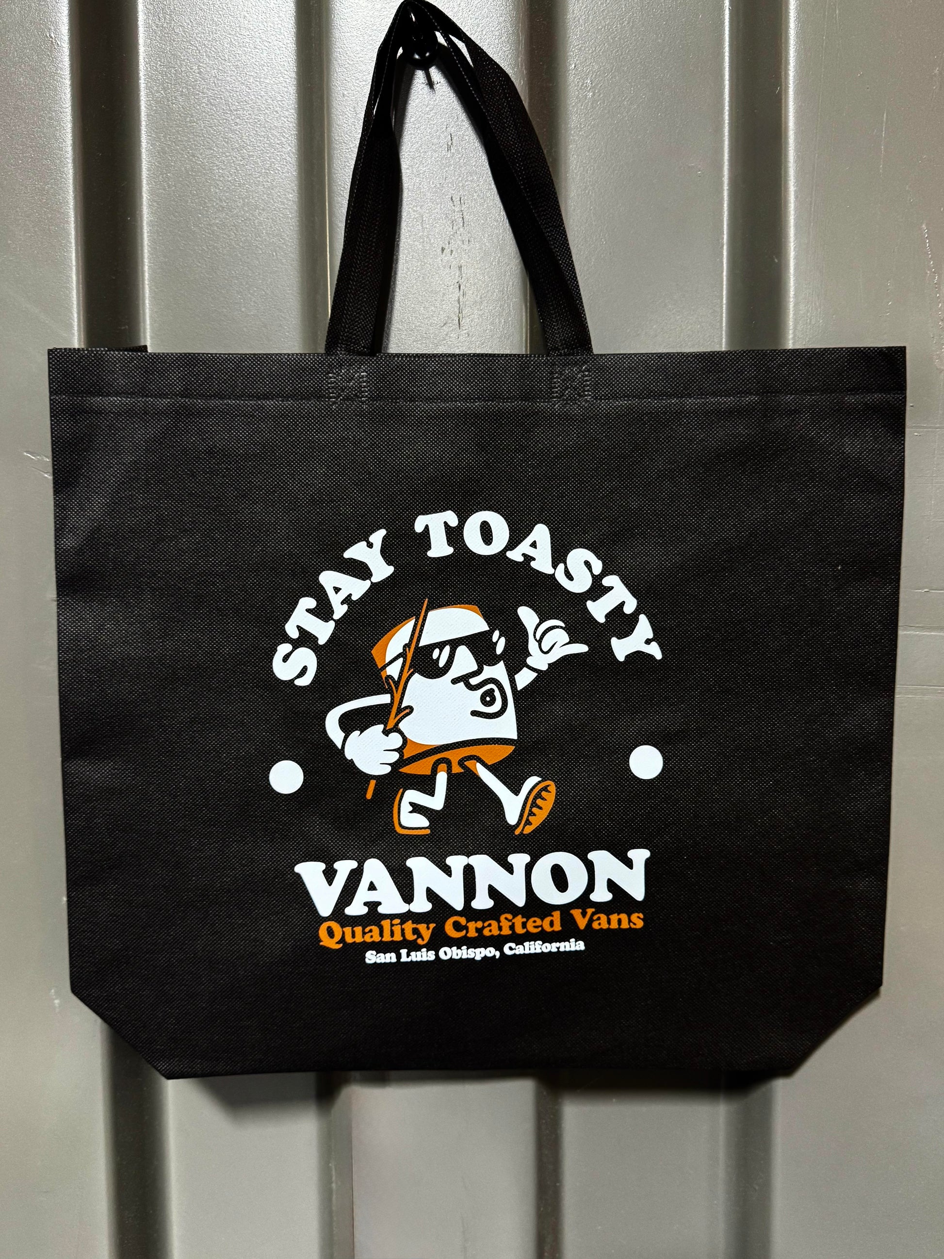 The STAY TOASTY Logo Tote features our signature marshmallow mascot design—a nod to campfire culture and the spirit of outdoor adventure that connects every VANNON build to the wild places beyond the pavement.